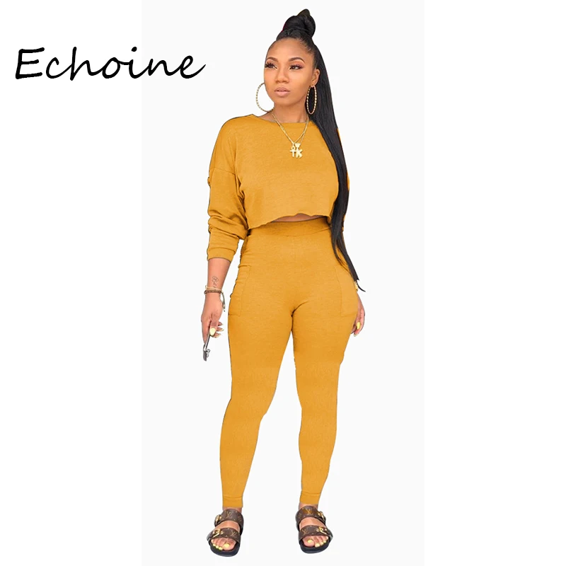 Product Name: Echoine Herfst O hals Twee Delige Set Lange Mouwen Sweatshirt + Broek Pak Met Pocket Trainingspak Vrouwen Solid 5 Kleur Plus size 2XL