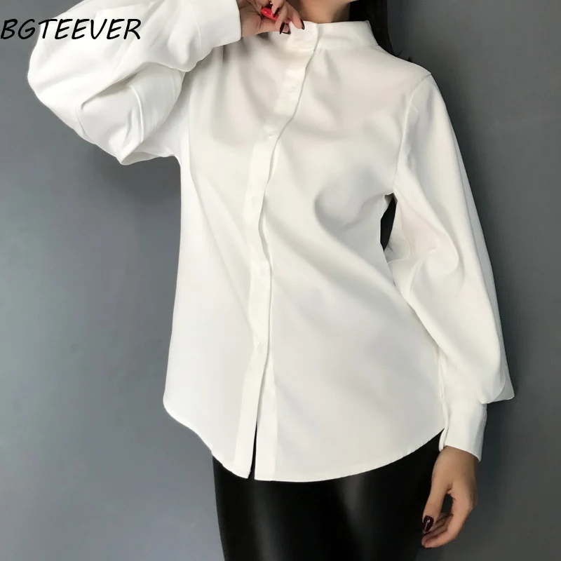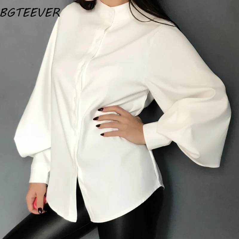 Special Offer BGTEEVER Vintage Stand Kraag Lantaarn Mouw Vrouwen Blouses Tops Herfst Thicken Losse Overhemd Vrouwelijke Casual Shirts 3 kleuren Discount 31% Today!