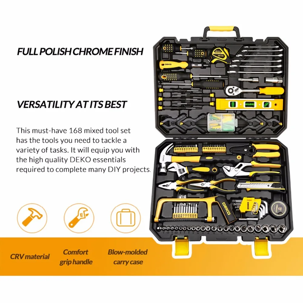 Special Offer DEKO 168 Pcs Handgereedschap Set Algemene Huishoudelijke Hand Tool Kit met Plastic Toolbox Opslag Case Dopsleutel Schroevendraaier Mes Discount 31% Today!
