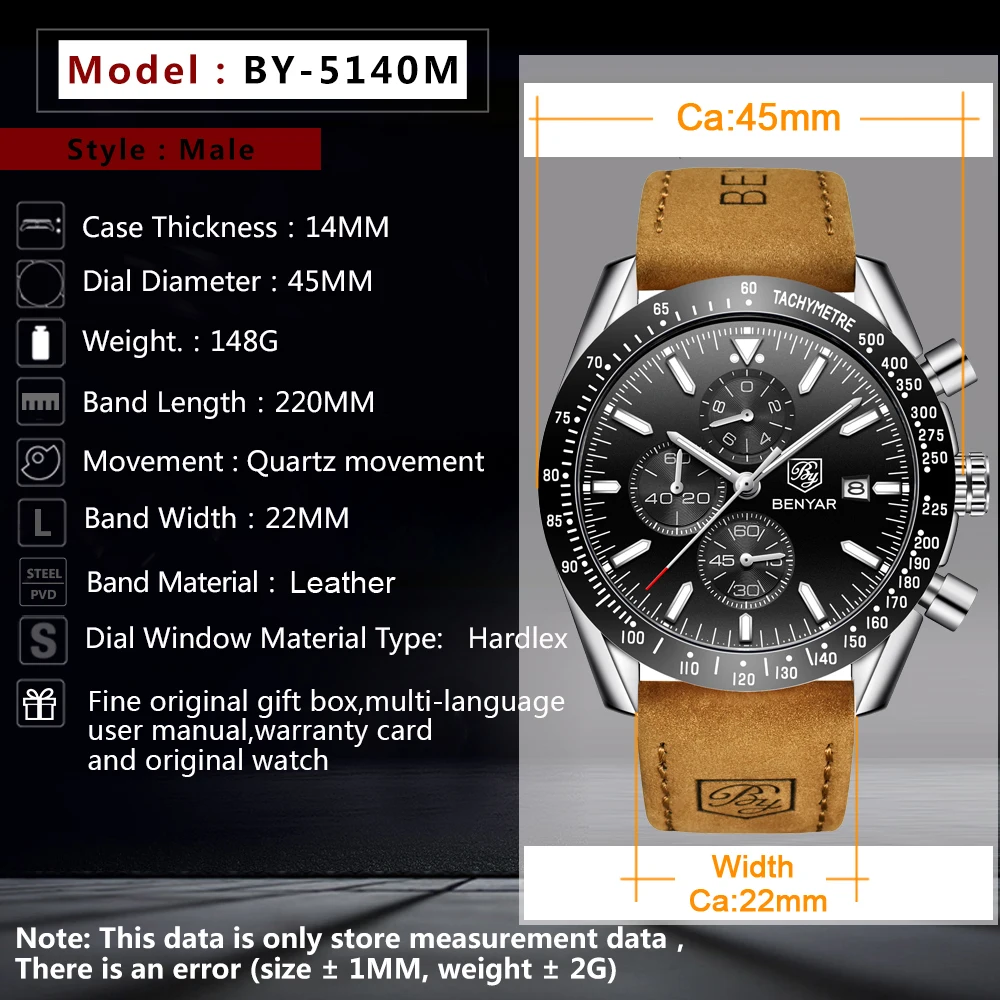 Product Name: 2019 Horloge Mannen Luxe Merk BENYAR Mens Blue Horloges Lederen Band Horloges heren Chronograaf Horloge Mannelijke Relogio Masculino