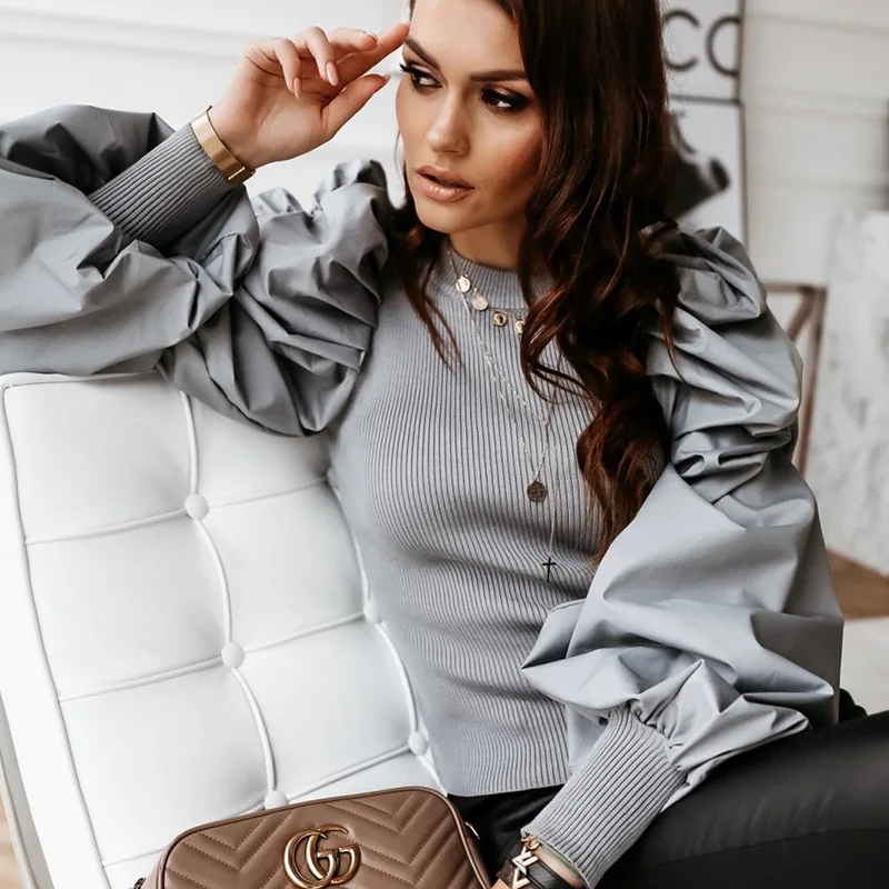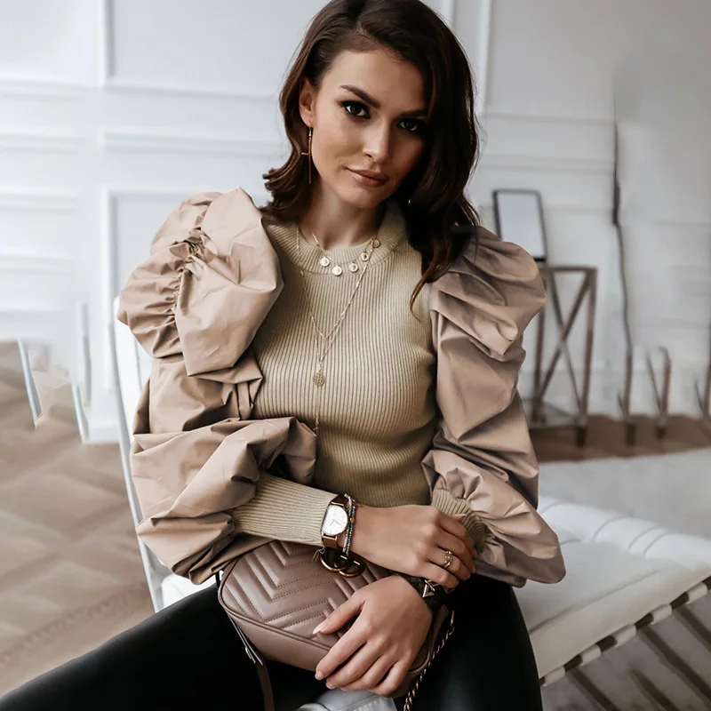 Product Name: Yimunancy Gebreide Top Vrouwen 2020 Lente 3 Kleuren Bladerdeeg Mouwen Dames Patchwork Lange Mouwen Elegant Top Blusas Streetwear
